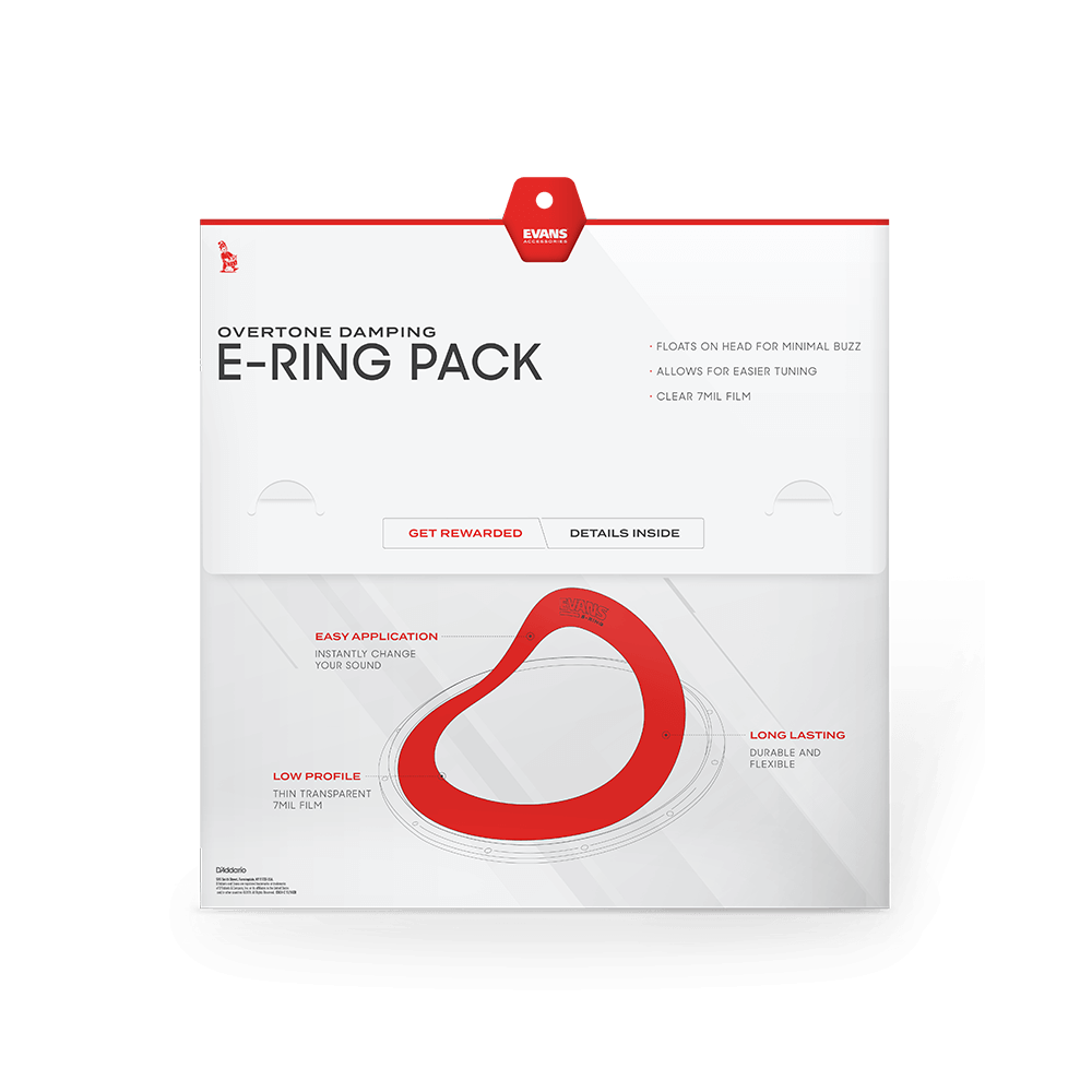 The EVANS E-Ring Packs contains easy-to-use external overtone control rings that float on the surface of a drumhead to remove overtones and flattens the drumhead's sound, allowing for easier tuning.
