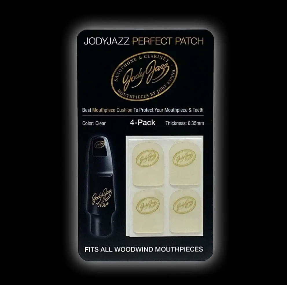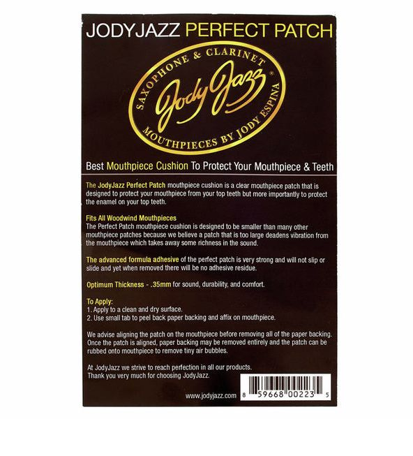 The JodyJazz Perfect Patch mouthpiece cushion fits all woodwind mouthpieces. This mouthpiece cushion is smaller than many others because we believe that too large a patch deadens vibrations from the mouthpiece which takes away a minute amount of richness in the sound. The Perfect Patch is the best clear mouthpiece cushion to protect your mouthpiece and the enamel on your teeth.